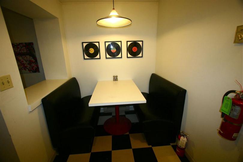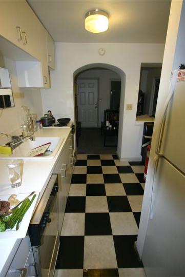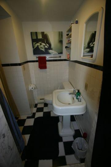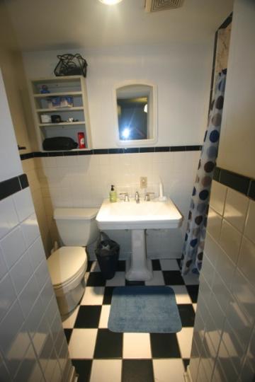 Stylish features of this cozy student rental include a fifties-style kitchen with an Italian porcelain tiled floor, a restaurant booth and a dishwasher, and a bathroom with black and white ceramic tile on the floor and half way up the walls as well as in the shower, which also has marble jambs. We’ve updated the entire space while keeping to the vintage vibe of the building, including architectural features like arched doorways between rooms.