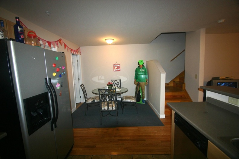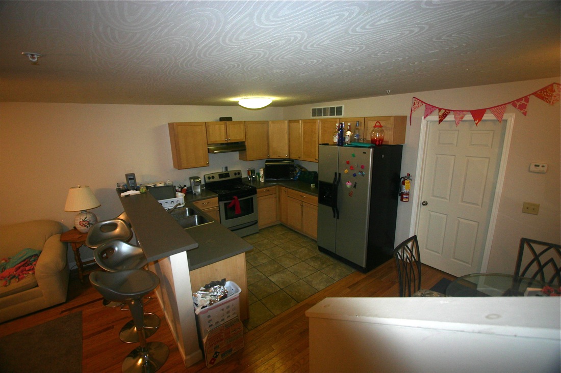The kitchen has a lot of cabinet space, stainless steel appliances including a dishwasher, stove and side by side refrigerator. There is also an eating area adjacent to the kitchen. The great-room feel of the common space makes this apartment an ideal place for friends who really love that roommate life.