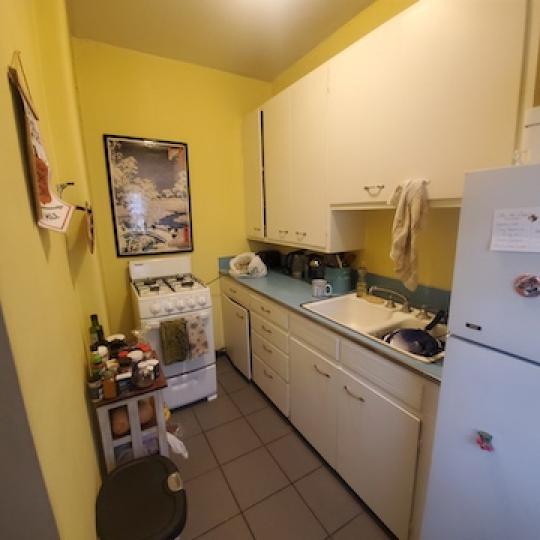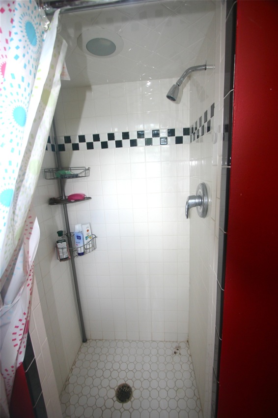 This 1-bedroom efficiency apartment has a large bedroom/living space with three big windows that let in a lot of natural light. There’s a separate kitchen, and a remodeled bathroom with a ceramic tiled shower. There is a large closet in the entryway hall, and also wall storage in the bathroom.