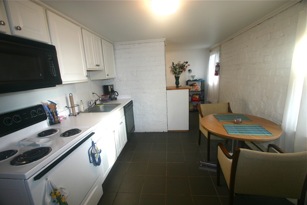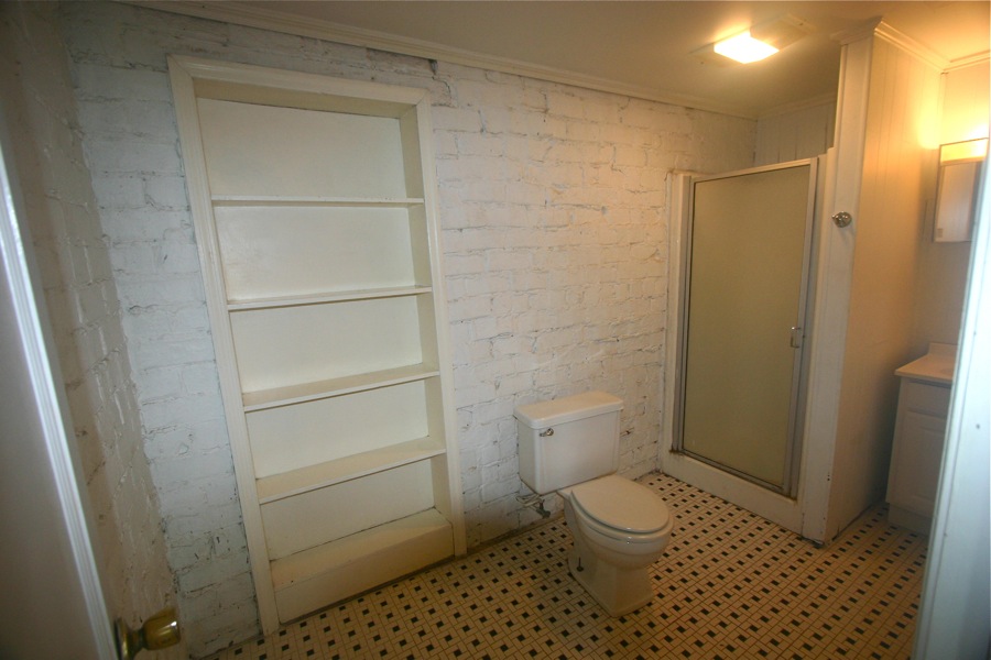 Featuring rustic white-painted brick walls that nod to the journey of the house, and Athens at-large, there’s enough room in the kitchen to put a large table and chairs. The bathroom, which features the same historic brick exterior, is large and includes built-in shelving.